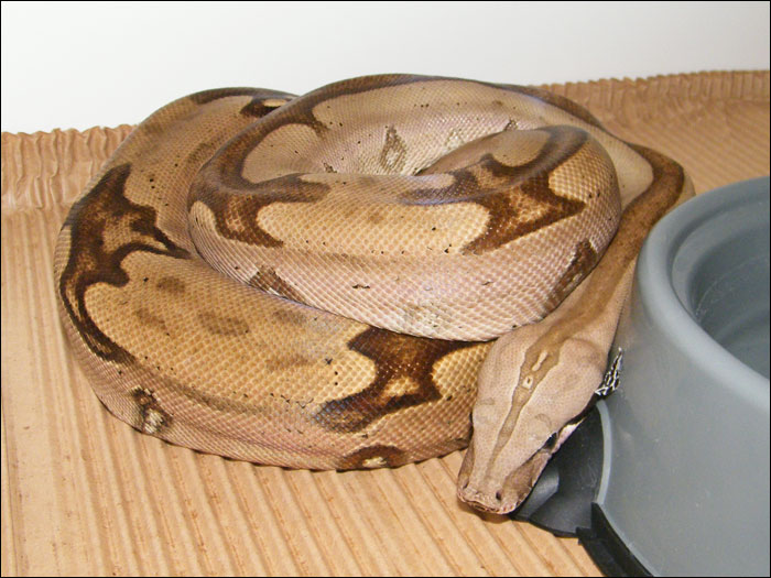 Boa constrictor hypomélanique, 50% het. anery. Mâle produit au Québec, né le 11 juin 2009. Ce mâle à été placé en reproduction avec une femelle Motley durant la saison 2012-2013, mais les résultats sont incertains. Il faudra attendre un peu plus tard au printemps 2013 pour s'assurer d'un résultat positif. |