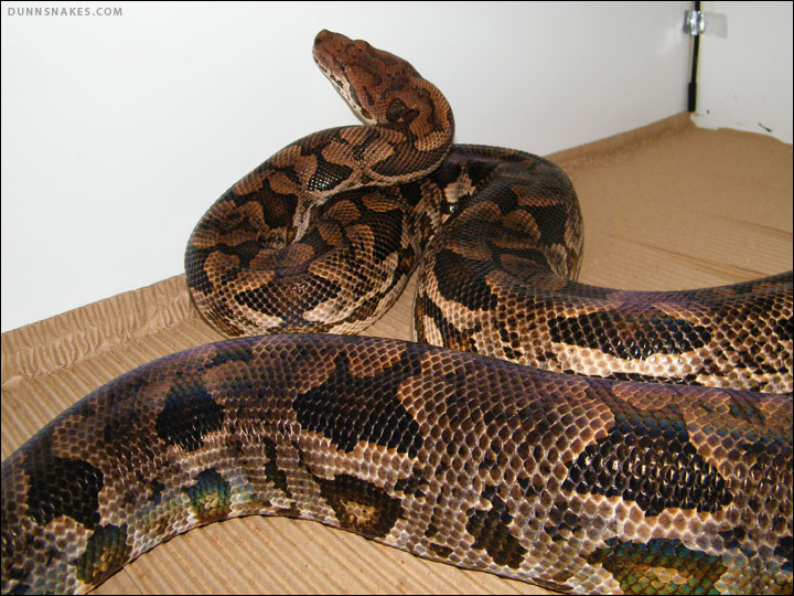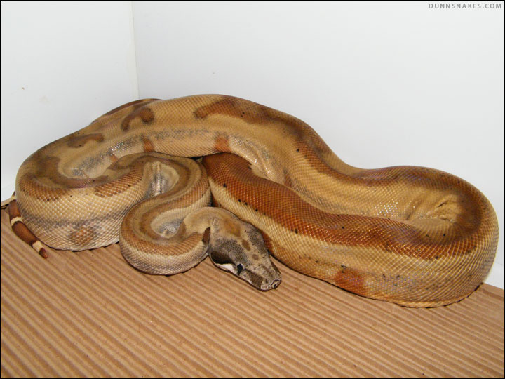Boa constrictor motley, het. albino. Femelle produit par Jeremy Stone en 2008. A été reproduite durant la saison 2012-2013 avec un mâle striped salmon mais le résultat est incertain, il faudra attendre un peu plus tard au printemps 2013 pour voir le résultat. |